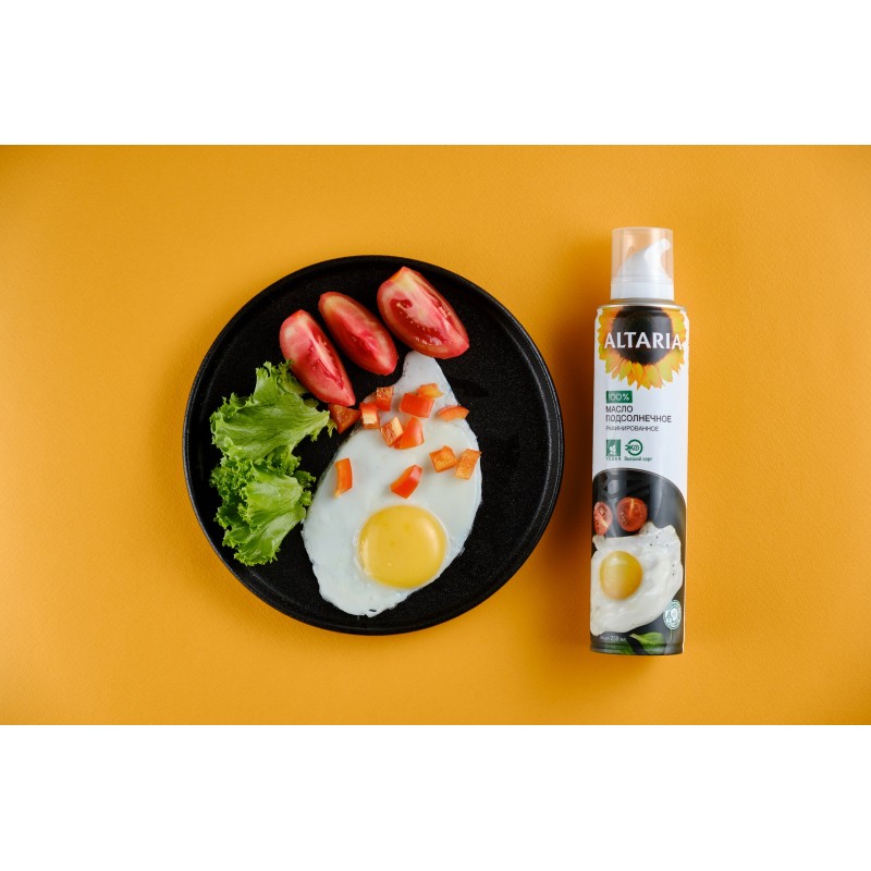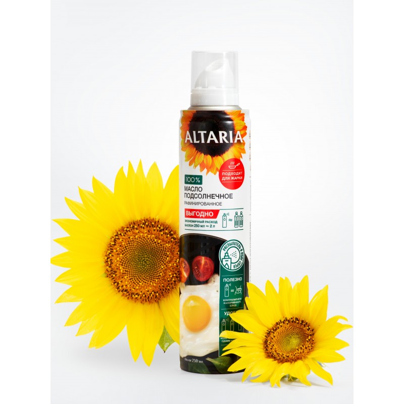 Высокое качество рафинированного подсолнечного масла от Altaria, упакованное в удобный баллончик с распылителем для точного дозирования.