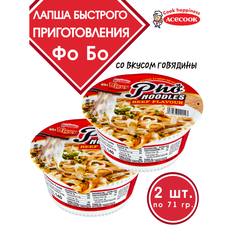 Фо Бо: Лапша быстрого приготовления с говядиной, 2 упаковки по 72г – Acecook