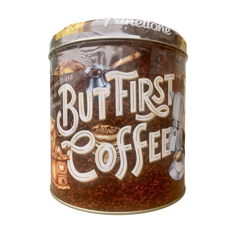 Кекс панеттоне "Но сначала кофе", с изюмом и цукатами, в коричневой жестяной коробке,1кг, Battistero