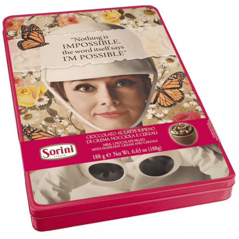 Стильная жестяная коробка шоколадных конфет станет изысканным подарком для женщин и мужчин. Всех тех, кто восхищался талантом и красотой великолепной актрисы, одной из красивейших женщин мира - Одри Хепберн. На коробке нанесена цитата этой замечательной женщины: "В самом слове "невозможно" есть возможность".