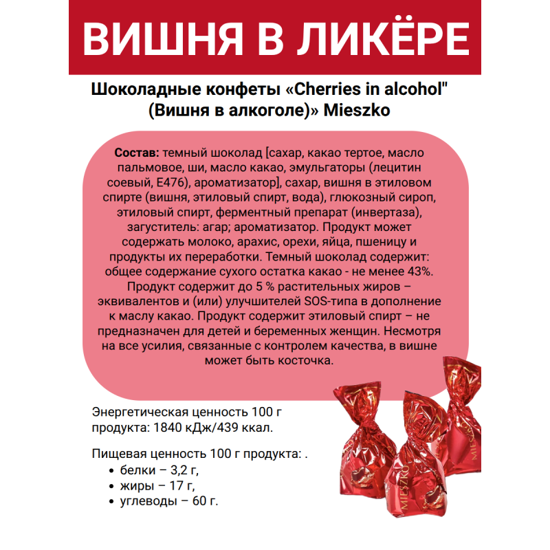 Конфеты шоколадные "Вишня в ликере", 500гр., Mieszko