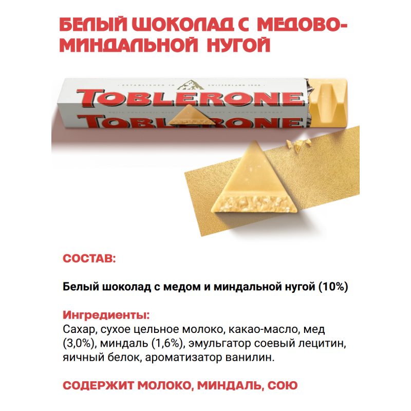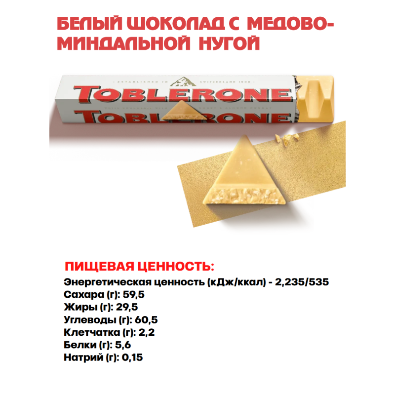 Шоколад белый TOBLERONE с медово-миндальной нугой, 100 гр.