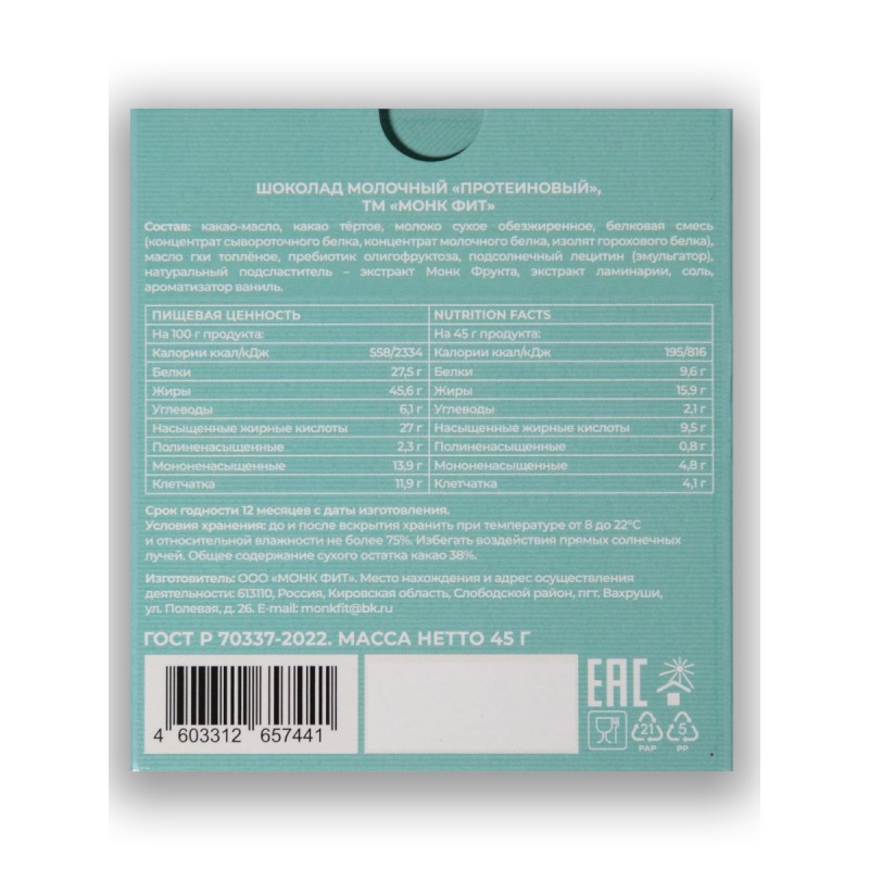 Шоколад молочный, протеиновый, 2упак по 45 гр., Монк Фит