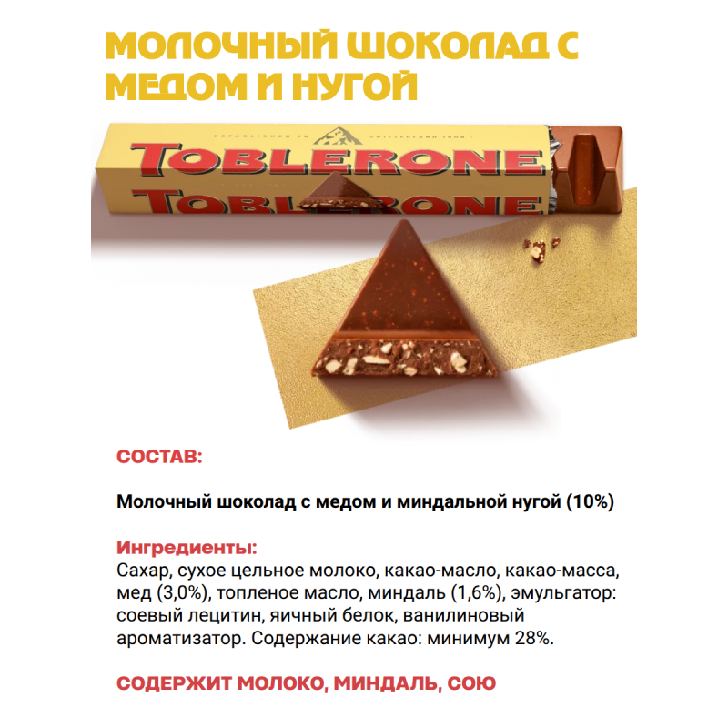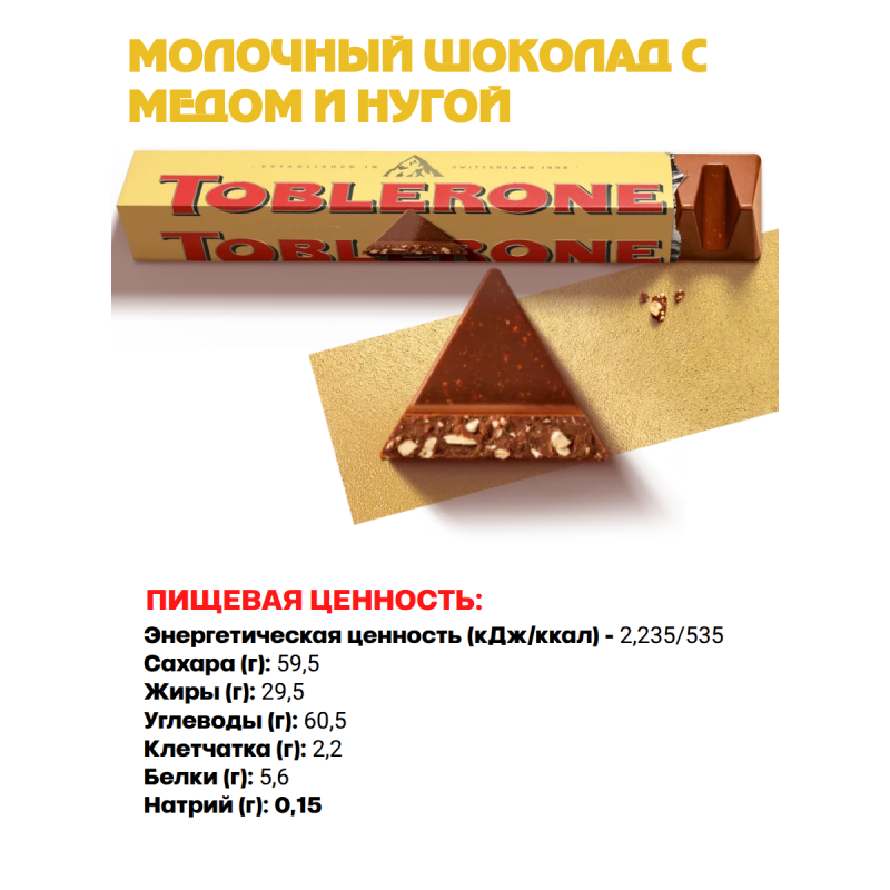 Шоколад молочный TOBLERONE с медово-миндальной нугой, 2шт по 100 гр.